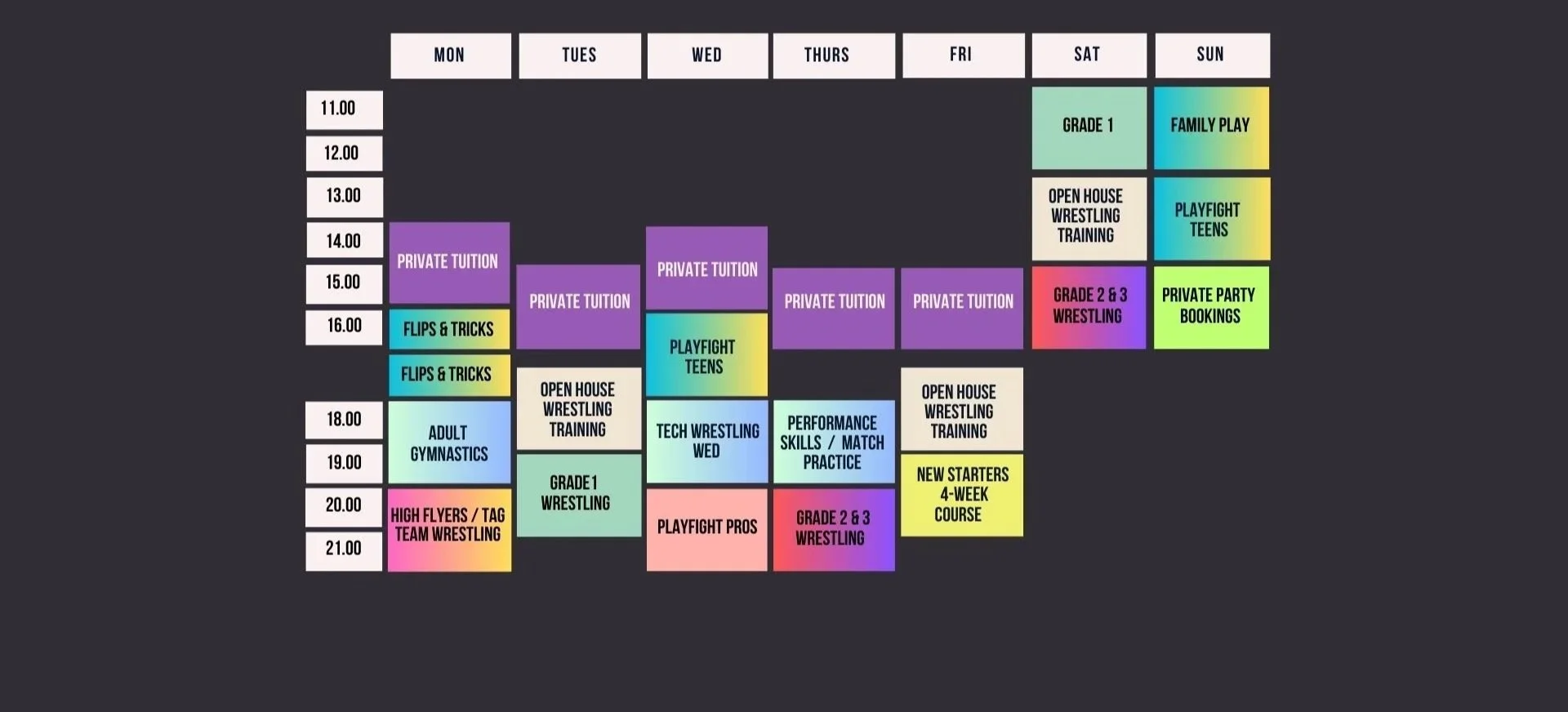 Our weekly schedule features a mix of graded wrestling classes, open house training sessions, gymnastics and specialist wrestling workshops, plus private tuition slots. Classes can be booked on a pay-as-you-go basis, or through our monthly money-saving memberships. Read about our graded training system & explore our membership packages to find the right option for you.